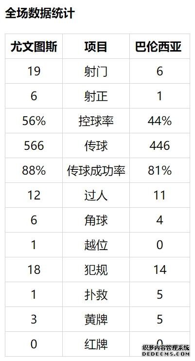 2018 12月8日下午3:30,北京时间,意甲第15轮,尤文图斯主场迎战国际米兰上半场,Galliardini没有援助,在塔的中部,基耶利尼几乎打败了,在下半场,逃跑的机会迪巴勒我做到了。Cancello传球,Manjukic决定头球。尤文图斯主场以1比0击败国际米兰,而且Yubu继续保持不败位置领先。 4分钟后,右侧Fossari踢罚球区的中心,什琴斯尼将球踢出在两次拳头,第7分钟,C罗从从左侧45度的路径得分,Dipara中路是我们的目标它达到了顶峰。 由于Fosariko离门将不太远,Matuidi的中锋在9分钟后左侧。Dibala在禁区内的左手射门被门将用一只手扑出,Desilio在左边被Mario拦截了10分钟。 后12分钟,从右侧13分发射C罗,留在什琴斯尼Fossarico是从受限区域16分的右侧撞击,从Pericic从左侧中心得分,Chellini是铅。 18分钟后,关闭Shkrynia在罗纳尔多场的左侧,Fosalico返回到基线,21分钟,右侧Fossarico已从基耶利尼清除。 比赛进行到第26分钟,Fossariko在右侧突破,Desilio在27分钟后从右侧横传球,而Fibalko从右侧踢球。 第28分钟,波利塔诺超越禁区,伊卡迪开出射门。加拉迪尼从禁区顶部射门,皮球击球。然后Szczesny没收球。 在30分钟内,Cancello从左侧到左侧去,Manjukic没有机会打门,博努奇是从右到左在33分钟内45次,从Bentankul 34分钟右制成的45度交叉。Manjukic的头球很容易被Handanovic抓住。 比赛结束后40分钟,当迪巴拉的左角进入禁区时,博努奇在球高出前点点头。45分钟后,波利塔诺在禁区右侧开出一球,斯泽斯尼得分球。 在47分钟内,Matuidi向防守区返回了一个错误。Iikaldi在禁区内的一半路上。Polatano敲门,被Bonucci挡住,51分钟前Matuidi在禁区前冲过门。 第52分钟,在马路Manjukic中间的方位禁区点55分飞抵Dibala的,从禁区发布Pianic面前的是禁区,第58分钟,C罗尝试远投。从前面伸出手。 59分钟后,决定Fosarico横从右侧,Pericic穿过的从左侧45度的路径,汉达诺维奇偷球,Bentancourt在64分钟犯了一个错误。它优于禁区内的拱门。 第65分钟,马图迪的中场一步,坎普洛离开前路后的底线,此时曼楚冲领先球,尤文图斯1-0领先国际米兰。禁区右侧有一个球,球撞到了墙上并标出了底线。 在75分钟后,Bentancourt的前场直接进入禁区,米兰达决定带头并决定从基线接球。从底线。 比赛进行到第82分钟,坎普洛的左手进入禁区,84分钟后,汉拿诺维奇抢到球,因为罗纳尔多在禁区外任意球。 第85分钟,C罗纳尔多将球带入禁区并取消了基线。第89分钟,凯塔离开了禁区,没有任何机会佩里奇能够打门。从左到中,基耶利尼转身。 91分钟后,Asamoah越过左侧,而且Cancello前往球的位置并不到目前为止,Martinez就在禁区外。 比赛结束时,尤文图斯主场1-0击败国际米兰。